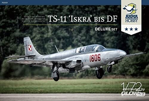 Arma Hobby 1/72 scale TS-11 Iskra Deluxe Set is a detailed plastic model kit featuring parts for assembling the Iskra trainer. Includes decals and precision pieces to build a display-grade replica for aviation hobbyists.
