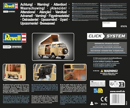 Revell VW T2 Camper Easy Click System Model Kit offers a detailed 1:24 replica with precision-fit parts, rotatable wheels, and a vivid interior. Simple assembly, colorful components, authentic decals, and display-ready presentation for collectors and hobbyists.