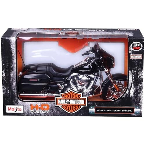 Premium Maisto collectible: the 2015 Harley Davidson Street Glide in sleek black, scaled at 1/12 for an eye-catching display piece. Die-cast construction with select plastic parts delivers a sturdy, authentic presence on any shelf or desk.