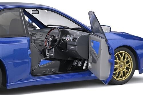 A 1:18 scale Solido model of the 1998 Subaru Impreza 22B in Sonic Blue. This detailed collectible captures the iconic rally design with precision painting and clear styling cues, ideal for display and automotive memorabilia collections.