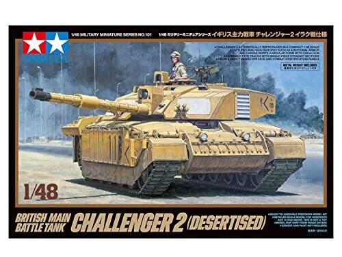 Experience the scale realism of the Tamiya 1/48 Challenger 2 Desertised MBT model kit, capturing desertised silhouette, modern panels, and a 120mm rifled gun. Includes Iraq War-era armor features, simple assembly, and decals for customization.