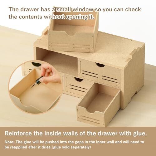 • This assembled drawer rack features five sturdy storage boxes arranged for quick access to tweezers, glue, paints, and small parts.