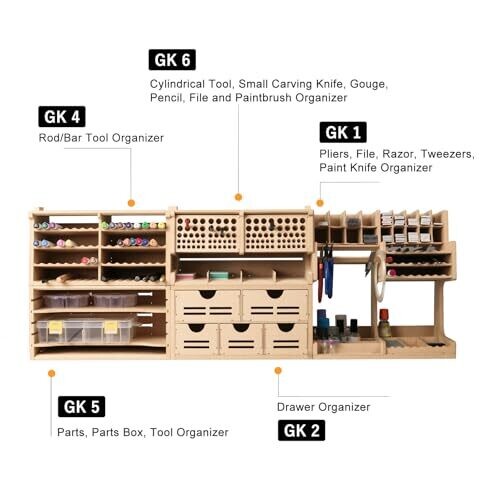 Bucasso plastic model tool organizer transforms clutter into a productive workspace. It stores pliers, tweezers, brushes, screwdrivers, and small parts neatly, expandable with GK components to fit your setup. Durable MDF, easy assembly, ready to create.