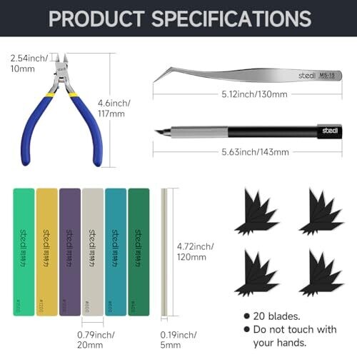 • 1 x model clippers, 6 x hobby sanding sticks (#400, #600, #800, #1000, #1200, #1500), 1 x model panel line pen, 20 blades, 1 x tweezer