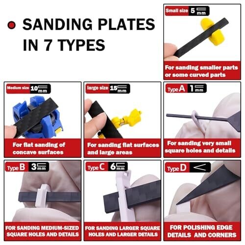• Includes 3 rectangular plates (5mm, 15mm, and 20mm widths) for regular sanding on parts of different sizes.