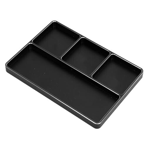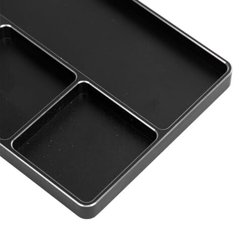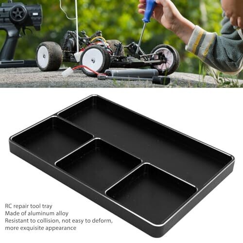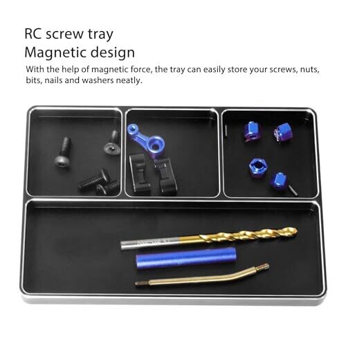 Universal screw tray with magnetic pad keeps screws, bits, and small parts organized during RC repairs. Four zones separate fasteners, built from durable aluminum alloy with a black finish. Compact, portable, ideal for RC cars, planes, boats, and more.