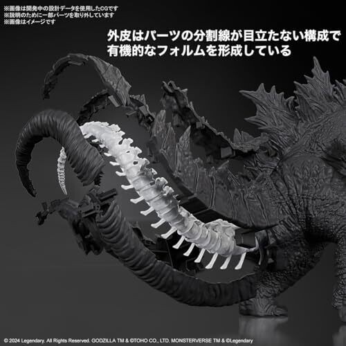 Premium Bandai Hobby kit of Godzilla (2024) from Godzilla x Kong: The New Empire, featuring a skeletal framework and high-density exoskeleton. Includes color-coded parts, a clear dorsal fin joint, two supports, and display options to show or hide the skeleton.
