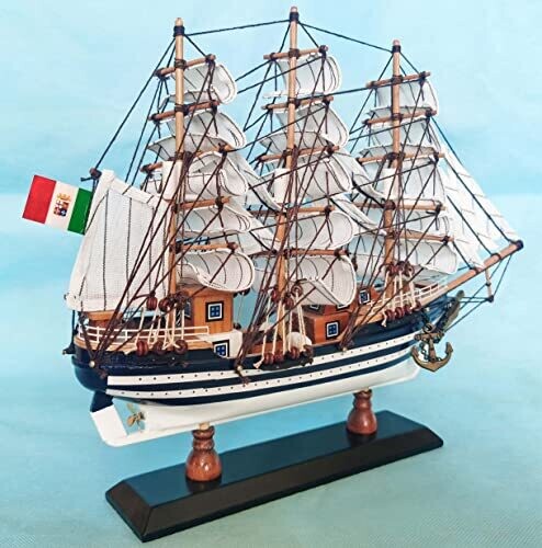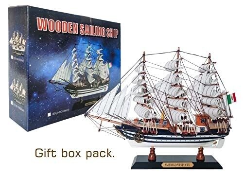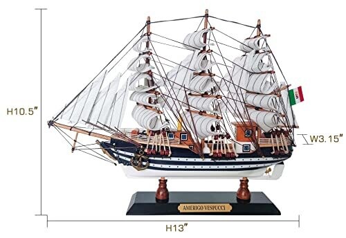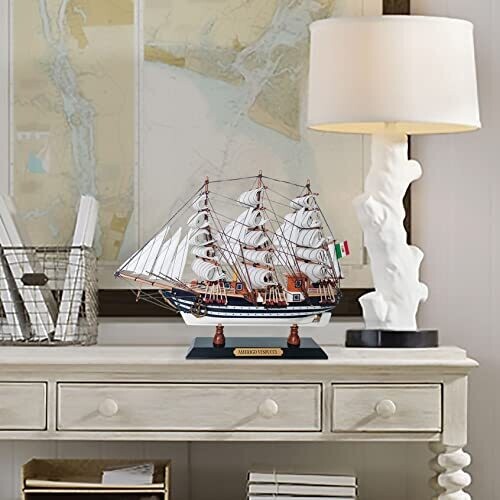 Refined maritime decor featuring a ready-to-display Amerigo Vespucci model ship. Handcrafted basswood hull with fabric sails, durable and maintenance-free, perfect for shelves or desks. Fully assembled, not a kit, ideal for gifting or enhancing nautical-themed spaces.
