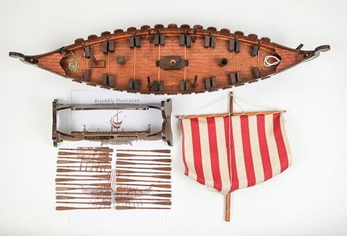 Handcrafted SailingStory Viking ship model features a plank-on-frame hull, with hand-stitched sails and authentic rigging. Includes KD packing and assembly instructions. Sized at 16.5