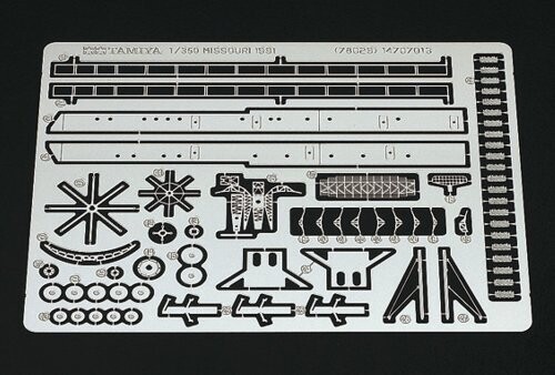 Tamiya’s Missouri (C. 1991) 1:350 scale model captures the Iowa-class battleship’s bridge, decks, radar domes and key details, with a display stand and optional photo-etched sets for air/surface search radars, antennas, and deck cable detailing.