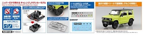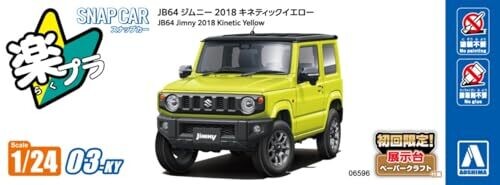 Immersive 1:24 scale model of the JB64 Jimny 2018 in Kinetic Yellow by Aoshima. Color-molded parts require no painting, and the clean snap-fit assembly delivers a compact display model that captures the square, rugged character of the vehicle.