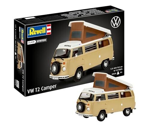 Revell VW T2 Camper Easy Click System Model Kit offers a detailed 1:24 replica with precision-fit parts, rotatable wheels, and a vivid interior. Simple assembly, colorful components, authentic decals, and display-ready presentation for collectors and hobbyists.