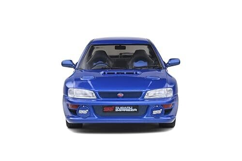 A 1:18 scale Solido model of the 1998 Subaru Impreza 22B in Sonic Blue. This detailed collectible captures the iconic rally design with precision painting and clear styling cues, ideal for display and automotive memorabilia collections.