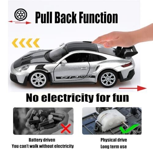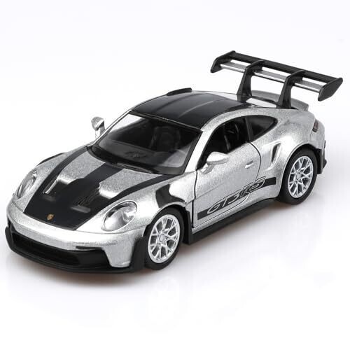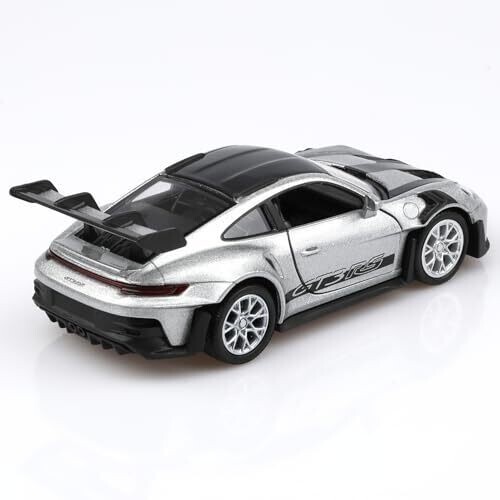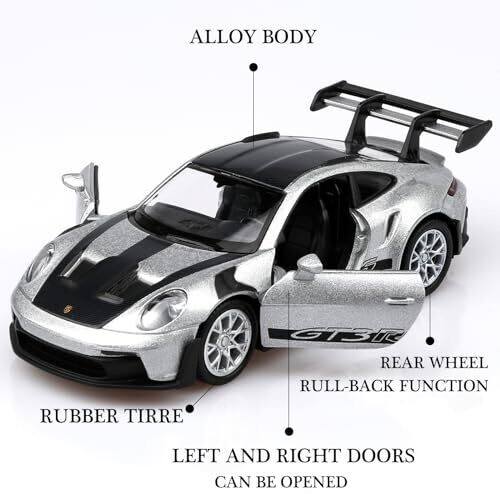 TOKAXI 1/36 Porsche 911 GT3 diecast car is a sleek pull-back toy crafted from zinc alloy and plastic. Finished in silver, it offers premium quality, battery-free fun, and compact display value for kids, collectors, and car enthusiasts.