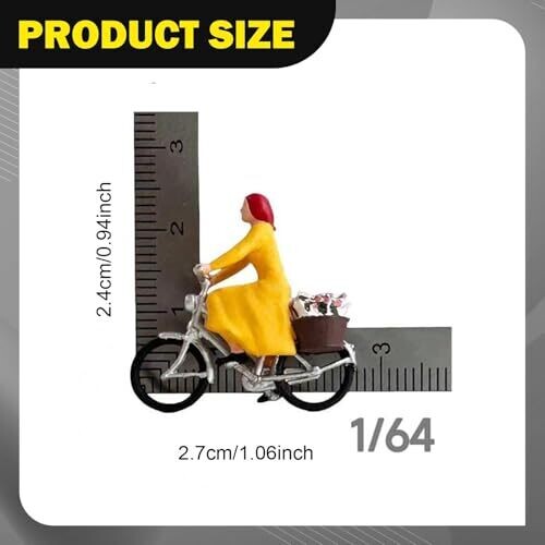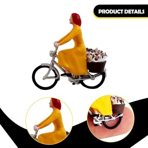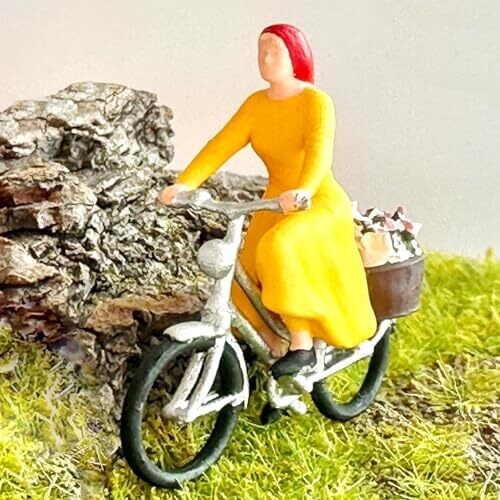 • Lifelike details: A female cyclist model wearing a yellow dress, riding a bicycle with a rear basket carrying items, designed to add realism to miniature scenes.