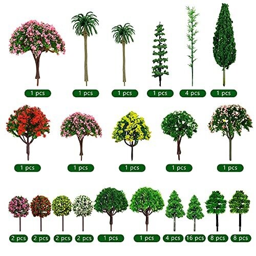 Capture imagination with 60 mixed miniature trees for train layouts, dioramas, and DIY projects. Vibrant colors, easy to position, lightweight, and ideal for micro-landscapes, campus scenes, and decorative displays in any scale.
