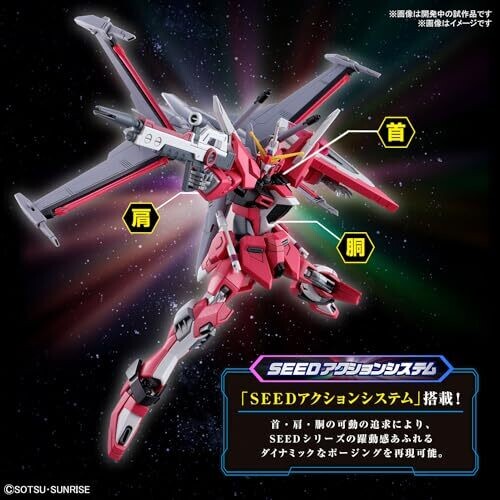 Premium HG Gundam kit with SEED Action System and four movable wings, offering cinematic poses and dynamic display. Includes beam weapons, shield with beam boomerang, head effects, and metallic silver parts for a standout, easy-to-assemble model.