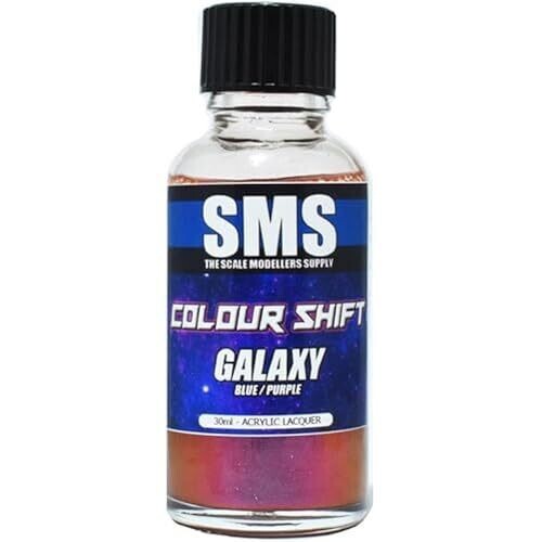SMS Galaxy Colour Shift paint delivers a dramatic blue-to-purple light-shifting finish ideal for sci-fi, fantasy, automotive, and display models. This airbrush-ready acrylic lacquer dries quickly, layers smoothly, and delivers vivid, high-pigment color on a range of modelling surfaces.