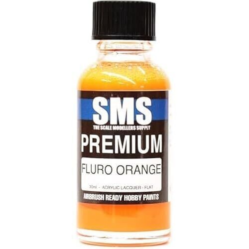 SMS The Scale Modellers Supply Premium Fluoro Orange 30ml is an airbrush-ready paint that delivers bold, glowing color for models. It sprays smoothly, dries quickly, and covers well in fewer coats, bonding strongly to plastic, metal, and resin for durable finishes.