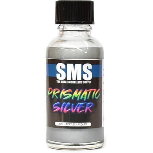 • Prismatic Silver 30ml airbrush-ready hobby paint from The Scale Modellers Supply, designed to bring your models to life with shimmering color shifts.