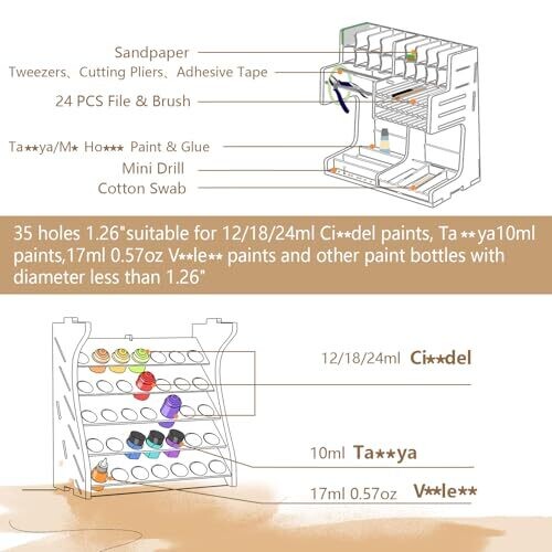 • stores multiple tools and up to 35 bottles of paint (various brands and sizes); supports common model paints such as 10 ml, 17 ml, and 12/18/24 ml bottles, depending on bottle shape and fit.
