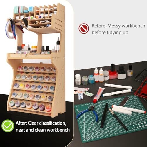 Marketing-focused model tool organizer that saves space with an all-in-one design. Includes storage for tools and a dedicated paint rack to keep paints, brushes, and accessories neatly organized on a compact workbench.