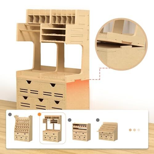 Bucasso GK2 Tool Storage Rack offers a tidy wooden paint organizer with five accessible drawers for tweezers, glue, paints, and small parts. Its MDF construction is eco-friendly, modular with GK series, and easy to assemble for daily modeling tasks.