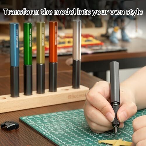 Precision scribing tool set designed for Gundam, cars, aircraft and other scale models. Seven tungsten blade tips in 0.075–0.5 mm sizes, color-coded for quick identification, plus a wooden rack and ergonomic aluminum handle for comfortable, portable panel lining.