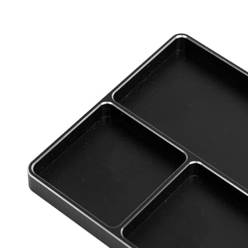 Universal screw tray with magnetic pad keeps screws, bits, and small parts organized during RC repairs. Four zones separate fasteners, built from durable aluminum alloy with a black finish. Compact, portable, ideal for RC cars, planes, boats, and more.