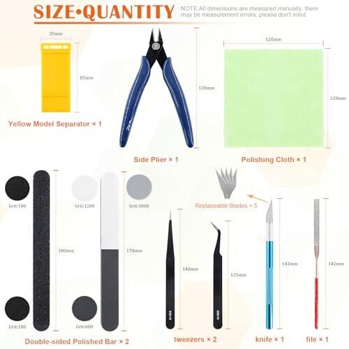 • 1 x side pliers, 1 x manual model tools file, 1 x pen knife and blade, 1 x yellow model separator, 1 x polishing cloth, 2 x double-sided polished bar, 2 x tweezers