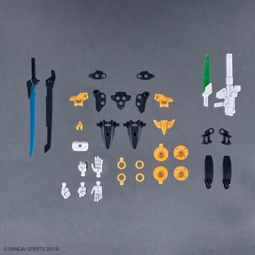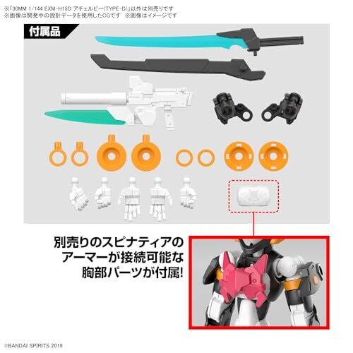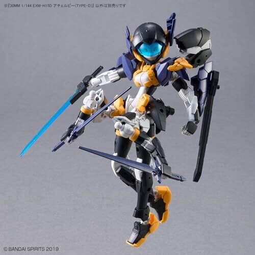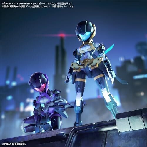 A collectible Bandai 30MM 1/144 EXM-H15D Acerby Type-D model-kit with interchangeable armor, adjustable visor, and a removable energy blade. Includes hands, joints, energy blade, Bade submachine gun, and armor options for dynamic poses and Spinatia-inspired styling.