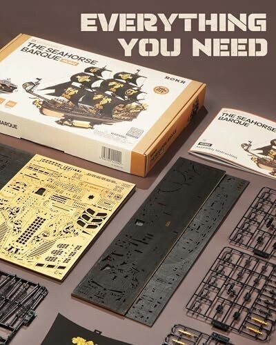ROKR's Seahorse Barque is a 1:100 scale sailboat kit for adults, featuring a double-deck hull, seahorse figurehead, 603 interlocking parts, and a glue-free, laser-cut build with interactive sails and a dramatic black-gold finish.