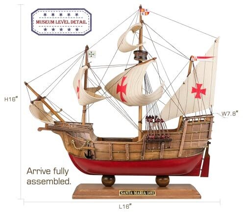 • Santa Maria replica crafted with a solid basswood hull and hand-stitched fabric sails for an authentic look.