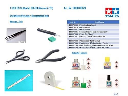 Tamiya’s Missouri (C. 1991) 1:350 scale model captures the Iowa-class battleship’s bridge, decks, radar domes and key details, with a display stand and optional photo-etched sets for air/surface search radars, antennas, and deck cable detailing.